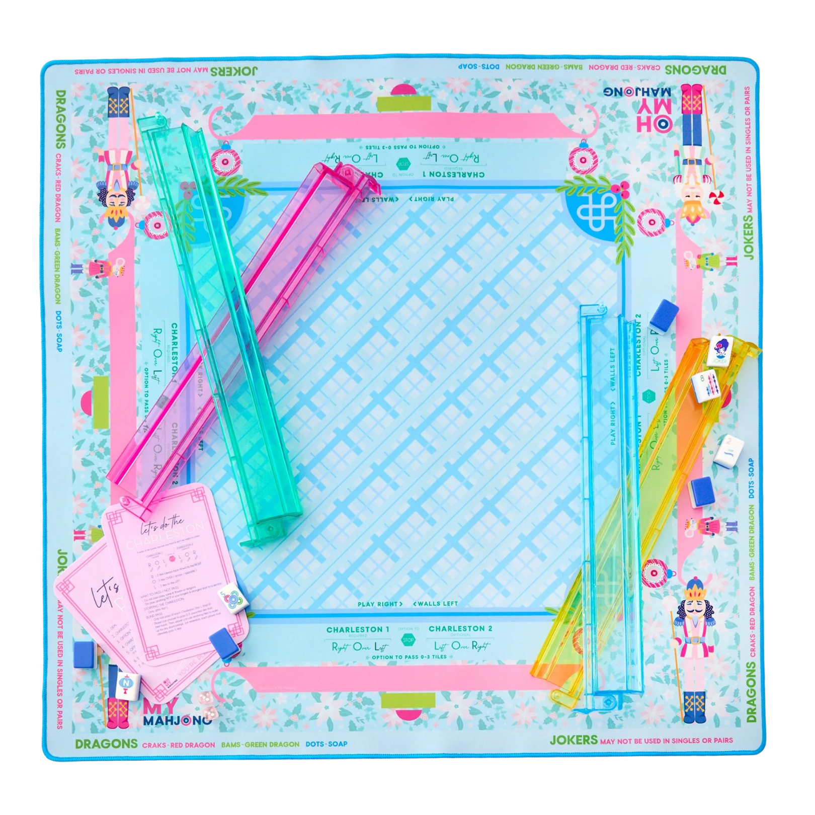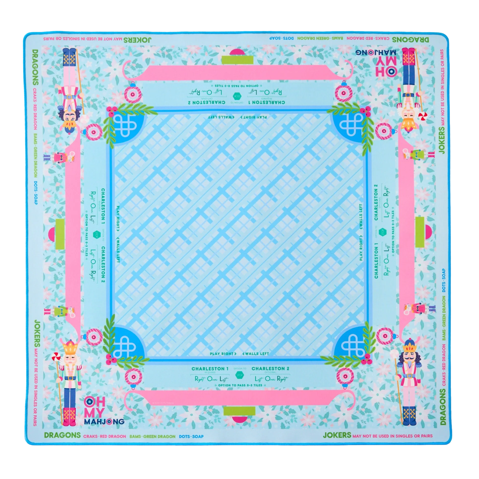 Introducing the Sugarplum Mahjong Mat—a festive delight that brings the magic of the holidays to your mahjong games. Adorned with charming poinsettias and whimsical nutcrackers, this mat features a primarily blue background accented with playful colors like pink and green. Crafted from neoprene, it offers a smooth, comfortable surface for your tiles, along with a non-slip bottom to keep everything in place. Along the sides, you’ll find instructional reminders, ensuring that even beginners can play with ease.