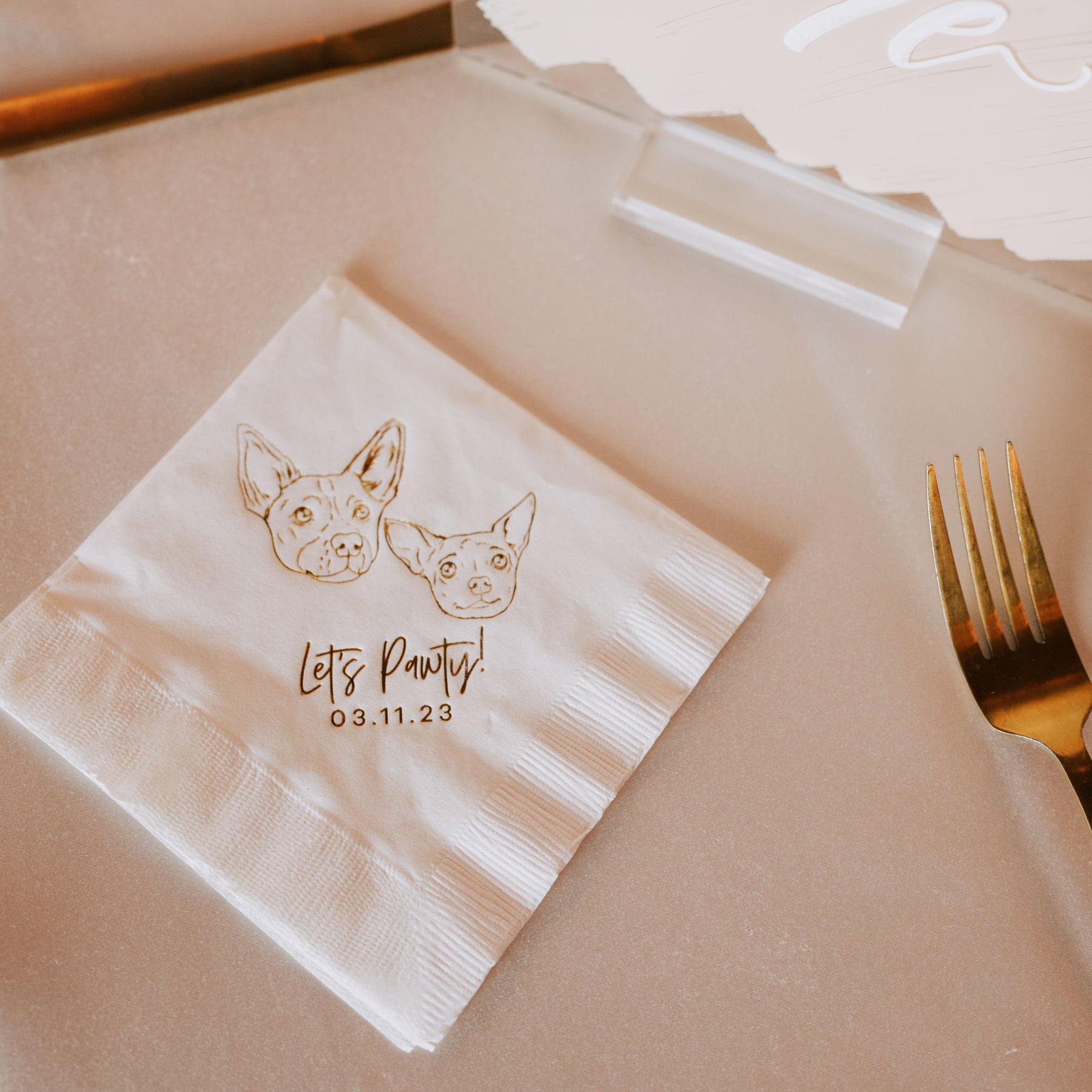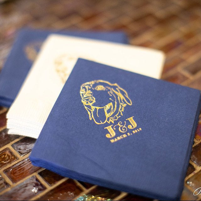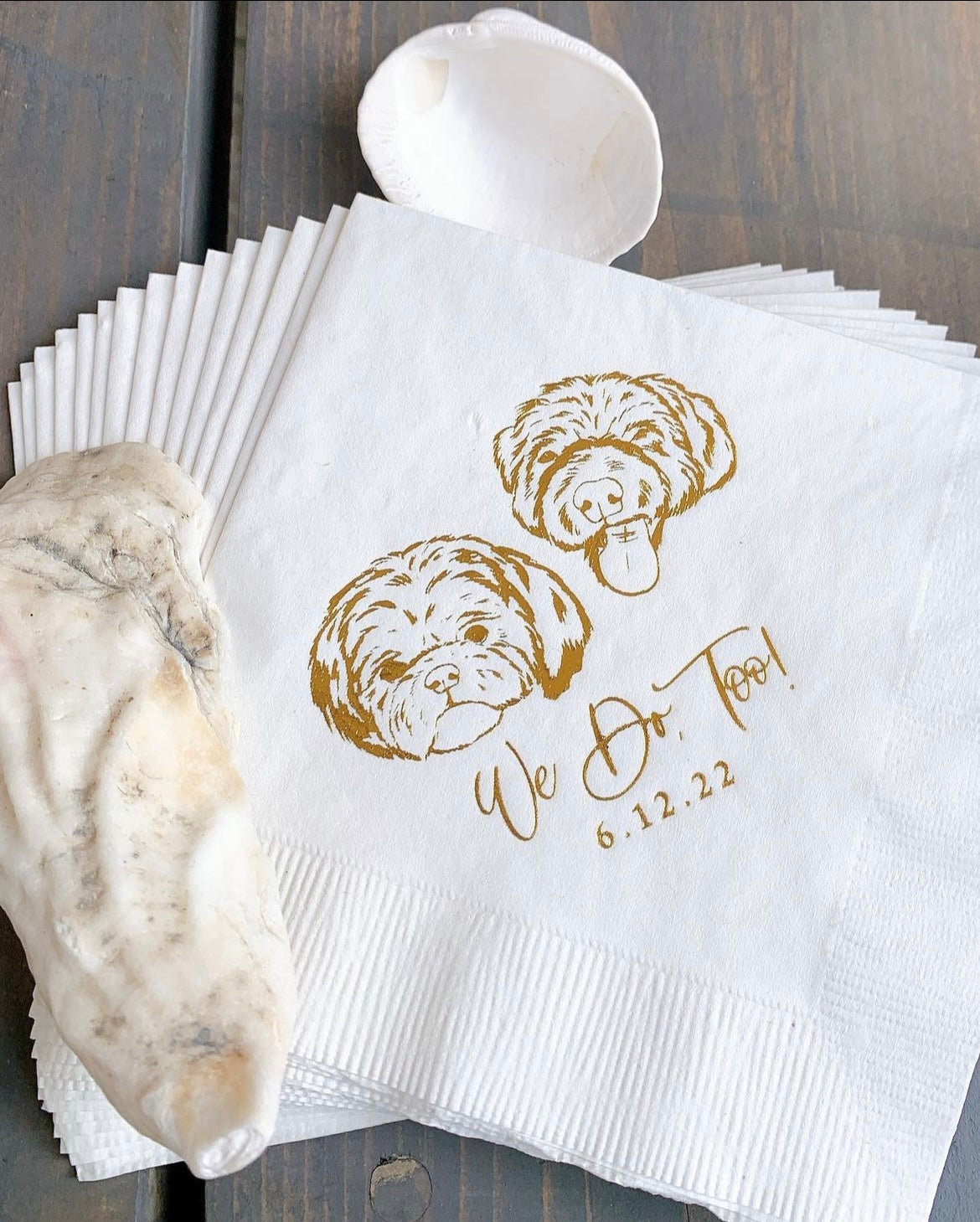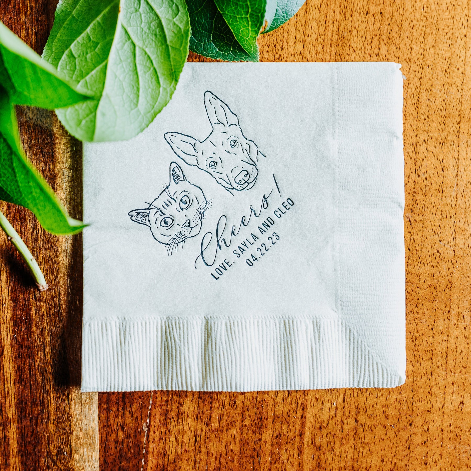 Sip Hip Hooray Custom Pet Cocktail napkins are the perfect way to incorporate your fur baby into your wedding! Our Custom Pet Portraits are hand drawn by our talented in house artists from your pet’s photos! See link below to add on the Custom Pet Art to your napkin order! You will also receive your own high resolution digital file of the drawing to use on other projects!