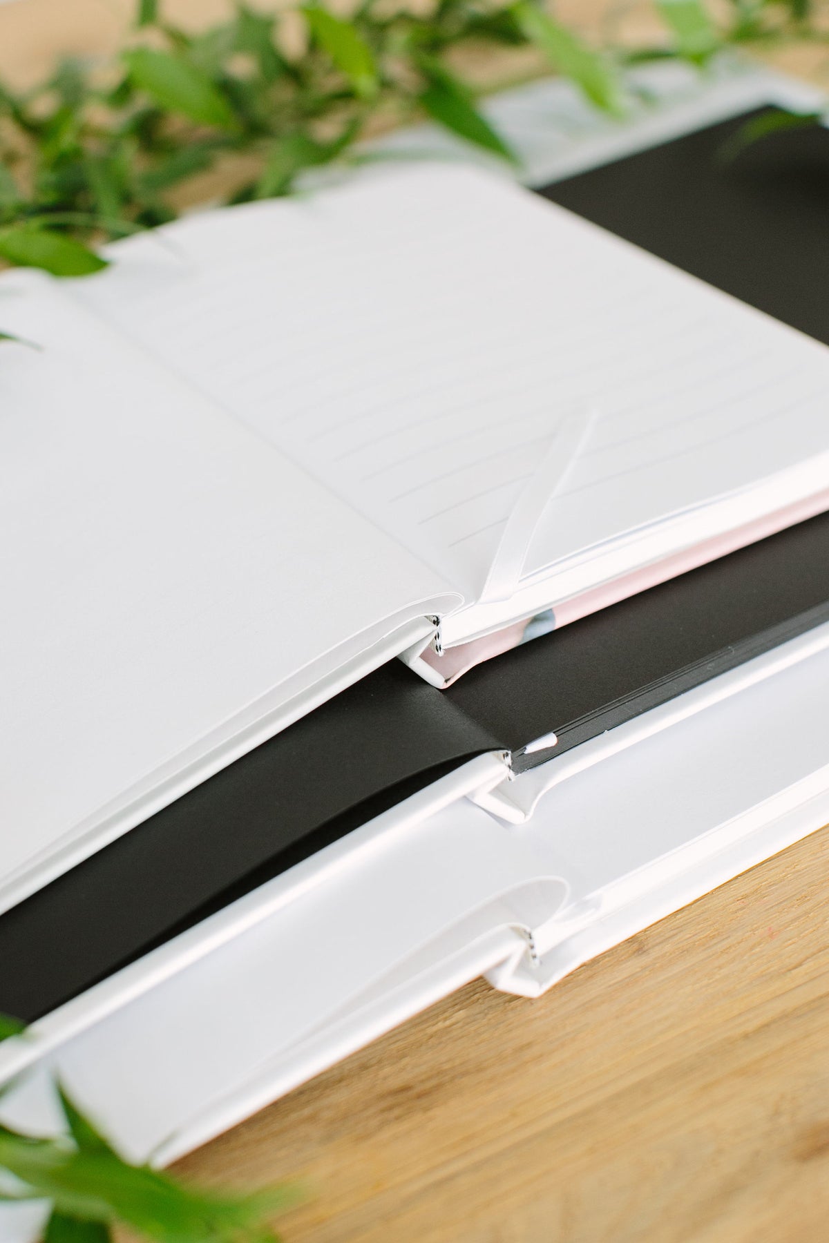 The lined pages will be white with lines on the front of each page only. The blank white pages will be solid white with no lines, and the black pages will be solid black with no lines.